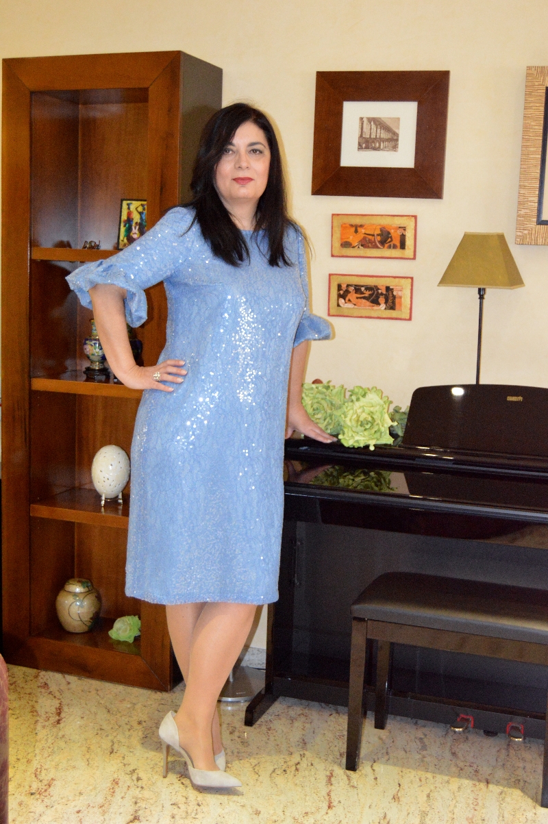VESTIDO CON DETALLE EN MANGA, CONFECCIONADO EN CREP SATÉN AZÚL Y CHANTILLÍ CON PAILLETES A TONO.