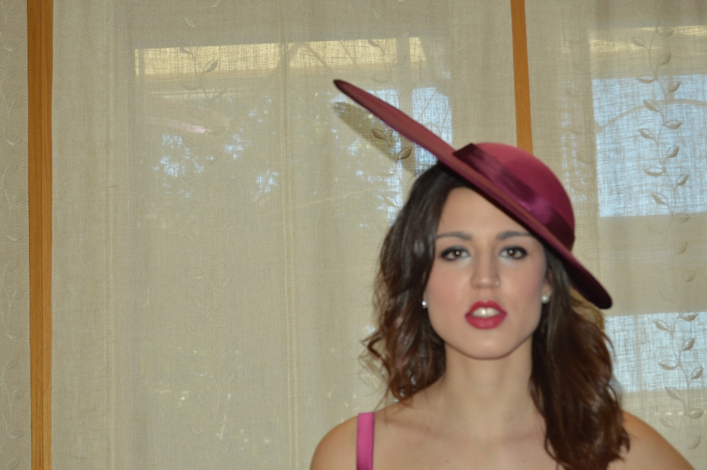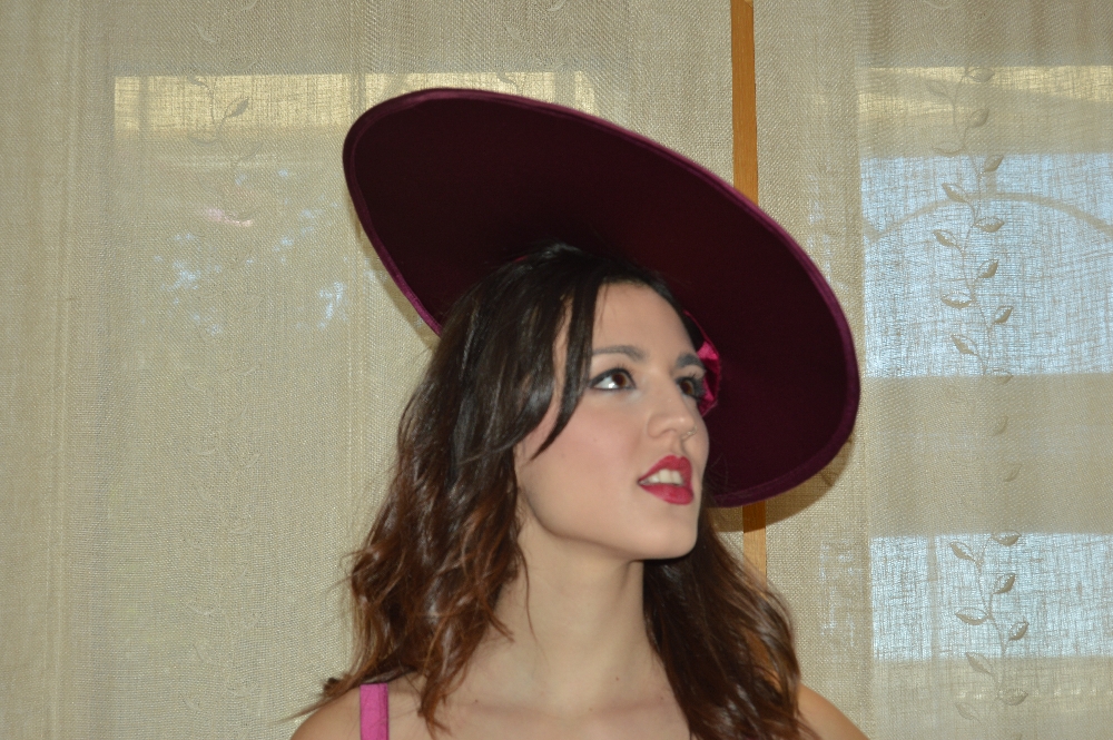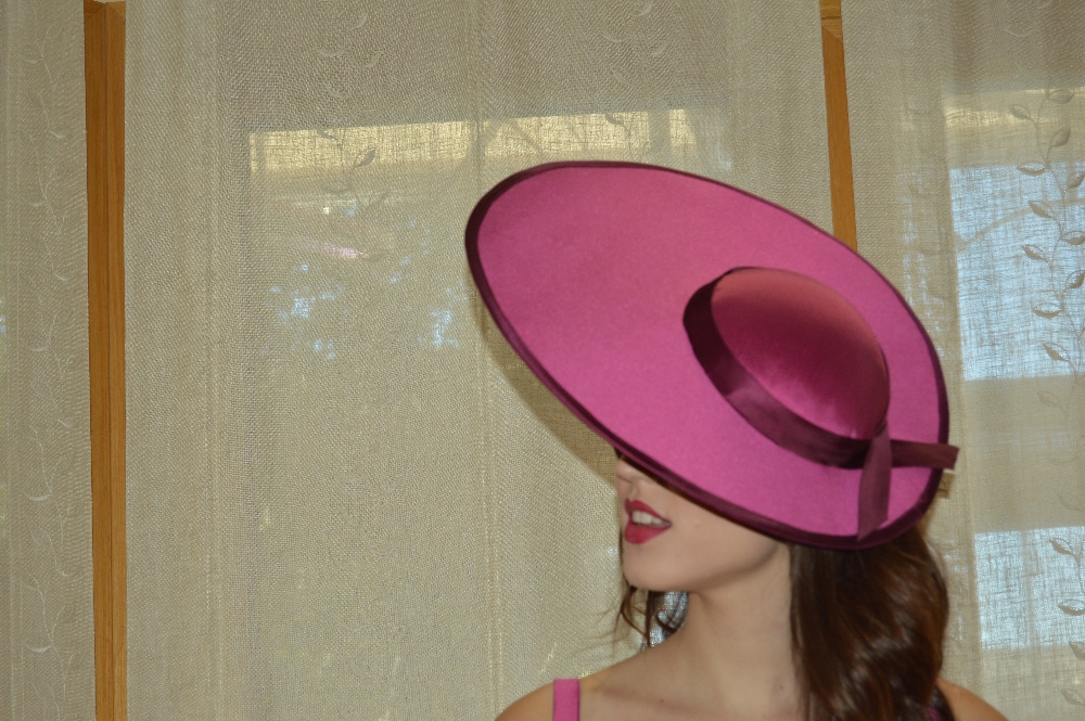 SEMI PAMELA REALIZADA CON ENTRETELA DE SOMBRERERIA FORRADA CON TELA BICOLOR EN FUCSIA, ADORNADA CON BIES EN MISMO TONO, SE SUJETA CON GOMA O DIADEMA.